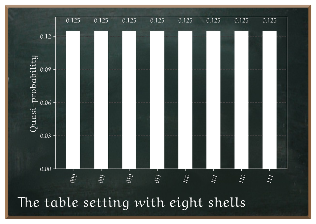 You prepare three A qubit is the basic unit of quantum information, representing a superposition of 0 and 1 states. Learn more about Quantum Bit. This gives you A basis state in quantum computing is one of the fundamental states that form the building blocks of a quantum system’s state space. For a single qubit, the basis states are and ; any other qubit state is a superposition of these. In systems with multiple qubits, basis states are all possible combinations of s and s (e.g., , , , and ), forming an orthonormal basis for the system’s Hilbert space. Learn more about Basis State. Eight different ways the setting looks like when you measure it. Eight shells to hide the gemstone.