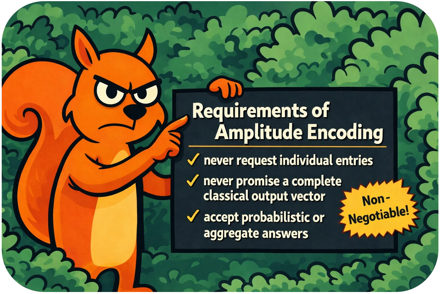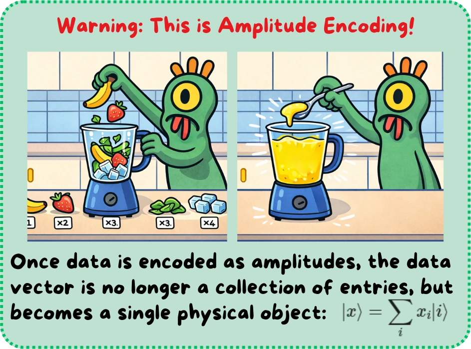 Amplitude encoding seems powerful, but it comes with fixed upfront costs and a major limitation: once your data is stored in amplitudes, you can no longer check it entry by entry. See what you lose, what you gain, and why only a small group of algorithms can actually benefit from it.